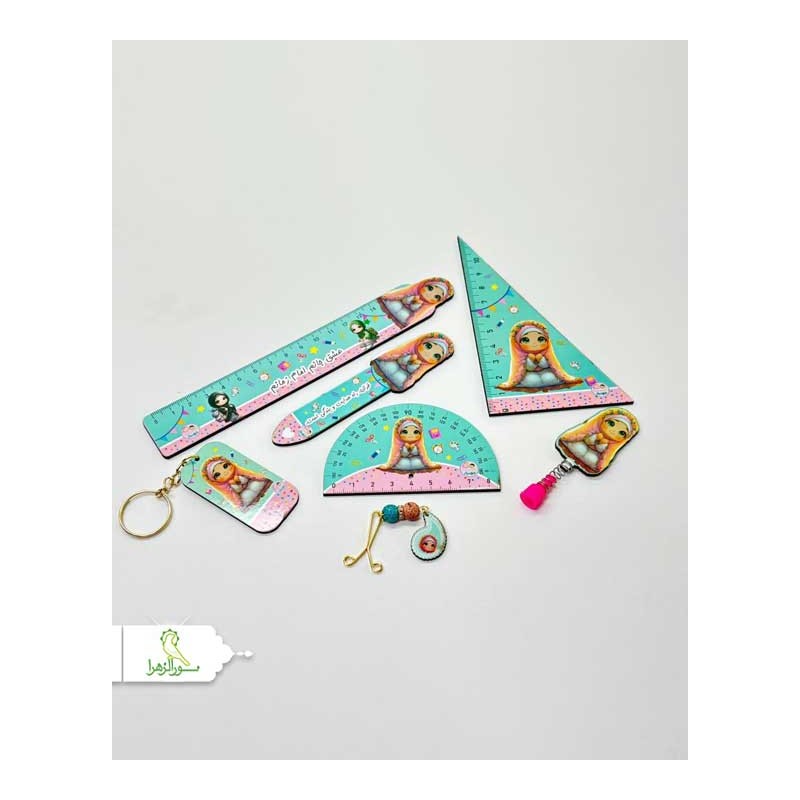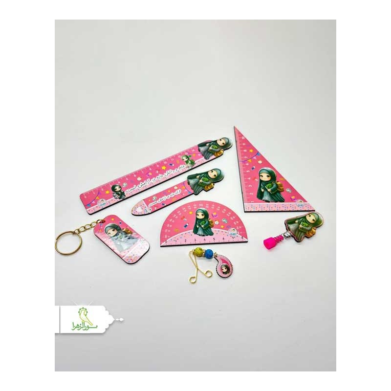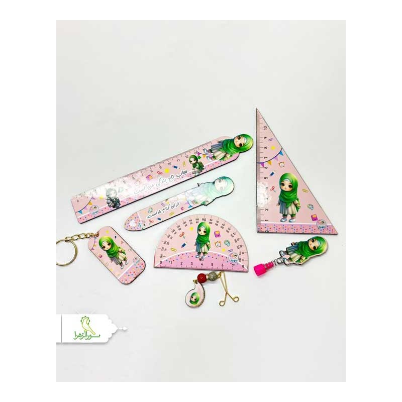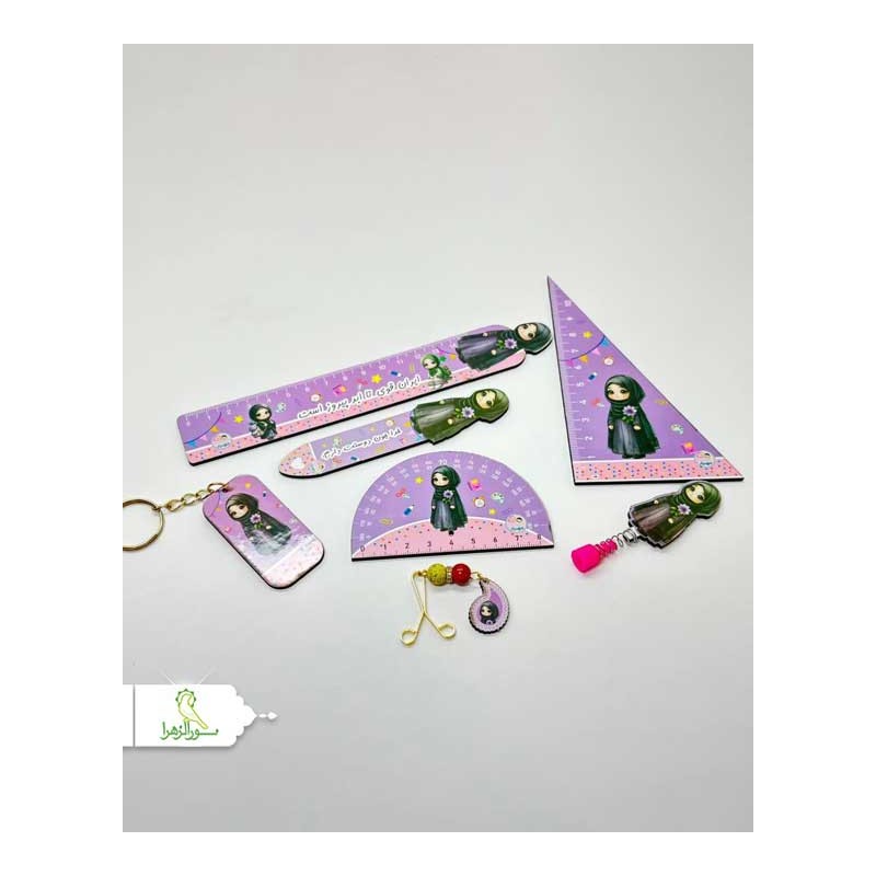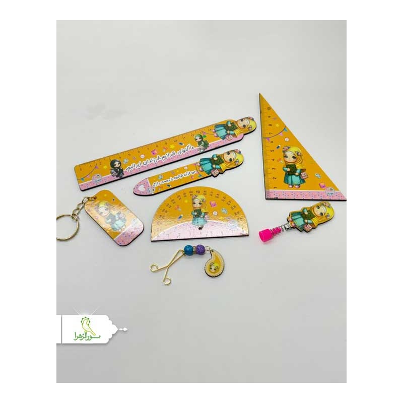 شامل خط کش چوبی، نشانگر قرآن، نقاله و گونیا،سرمدادی، جاکلیدی و گیره روسری